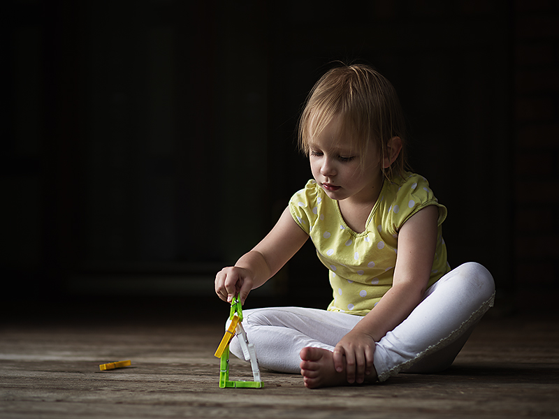 I was fascinated by the beautiful light on my porch before a storm. I laid a few clothespins on the porch for my daughter in the spot where I wanted to photograph her. Right away she started turning them into a house.